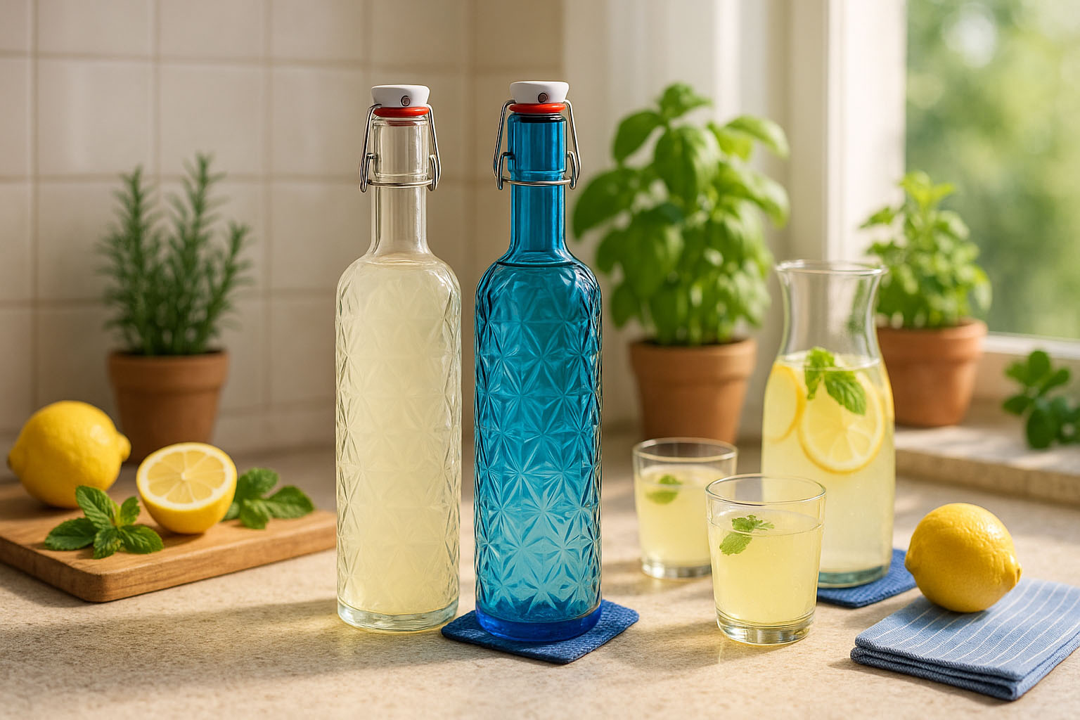 De serie „Oriente“ combineert kunstzinnige esthetiek met functionele perfectie. Geïnspireerd door oosterse elementen, valt deze fles op door zijn gefacetteerde lichaam, dat lichtreflecties op een elegante manier opvangt en het ontwerp een luxueuze diepte geeft. Verkrijgbaar in de kleuren helder en azuurblauw, zet hij bijzondere accenten en brengt exotiek en elegantie in elke omgeving. De luchtdicht afsluitende beugel sluiting zorgt niet alleen voor een veilige afdichting, maar benadrukt ook het traditionele vakmanschap dat in deze fles is verwerkt.