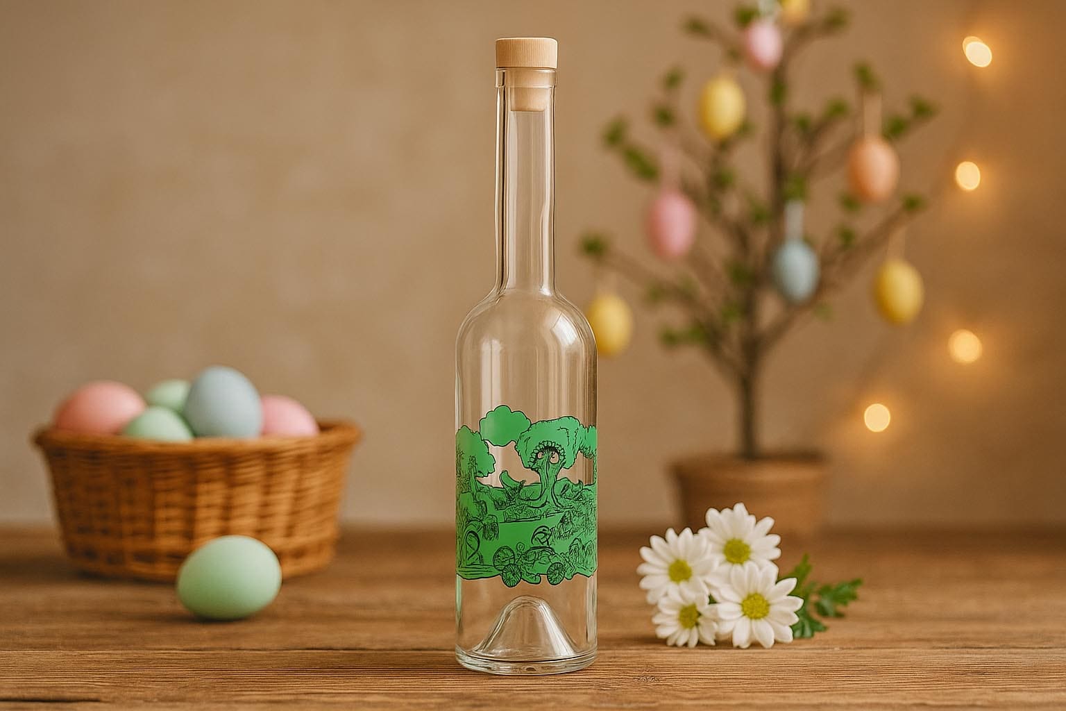 Flessenland 500 ml glazen fles 'Opera', motief: Vrolijk Pasen, hals: kurk