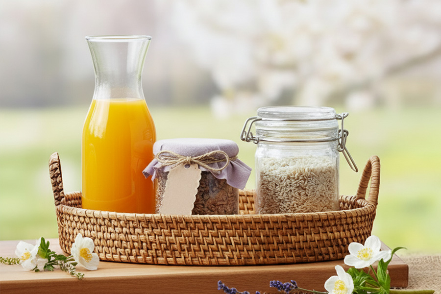 Een idee is de thematafel “Ontbijt in het groen”: presenteer jam, honing of sappen in decoratieve potten en flessen – bijvoorbeeld in klassieke honingpotten, kleine ronde potten of stijlvolle sapflessen. Vul de presentatie aan met proeflepels en kleine monsterpotjes, zodat uw klanten verschillende smaken direct kunnen proberen. Dit wekt vertrouwen in de kwaliteit van uw producten en stimuleert spontane aankopen.