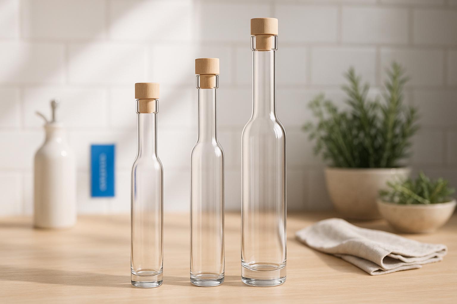 De Maximo-serie valt op door zijn slanke, harmonieuze design en is perfect geschikt voor het stijlvolle vullen van sterke dranken, likeuren en hoogwaardige oliën. De heldere glazen fles overtuigt met zijn lange hals, slanke lichaam en zacht aflopende schouders, die een elegante lijnvoering creëren. Verkrijgbaar in maten van 250 tot 500 ml, kan Maximo zowel in een blanke uitvoering als met stijlvolle motiefdrukken worden afgewerkt. De klassieke kurk zorgt voor een veilige afsluiting en een aantrekkelijke presentatie – passende sluitingen zijn verkrijgbaar in ons assortiment. Maximo combineert hoogwaardige afwerking met tijdloze elegantie en is de ideale keuze voor veeleisende vullingen.