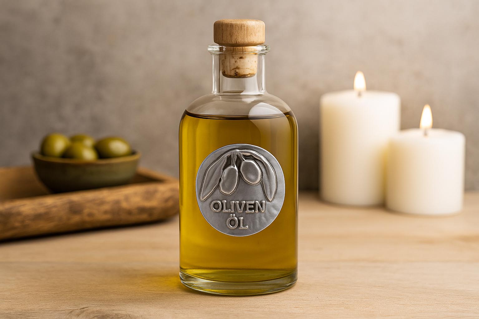 Flessenland Blikken etiket 'Olijfolie', metaal, zilver